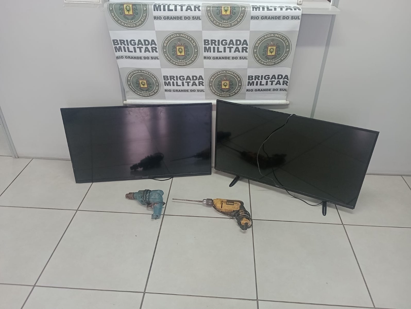 Televisões e furadeiras encontradas na casa da suspeita FOTO: Comunicação Social do 23°BPM